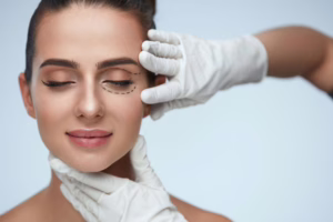 Facial Treatment. Portrait Of Beautiful Sexy Woman With Closed Eyes And Black Surgical Lines On Skin. Closeup Of Hands Touching Young Female Face. Plastic Surgery Concept. High Resolution