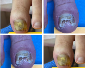 • Oczyszczanie paznokcia: Regularne usuwanie zgrubiałej i zakażonej części paznokcia za